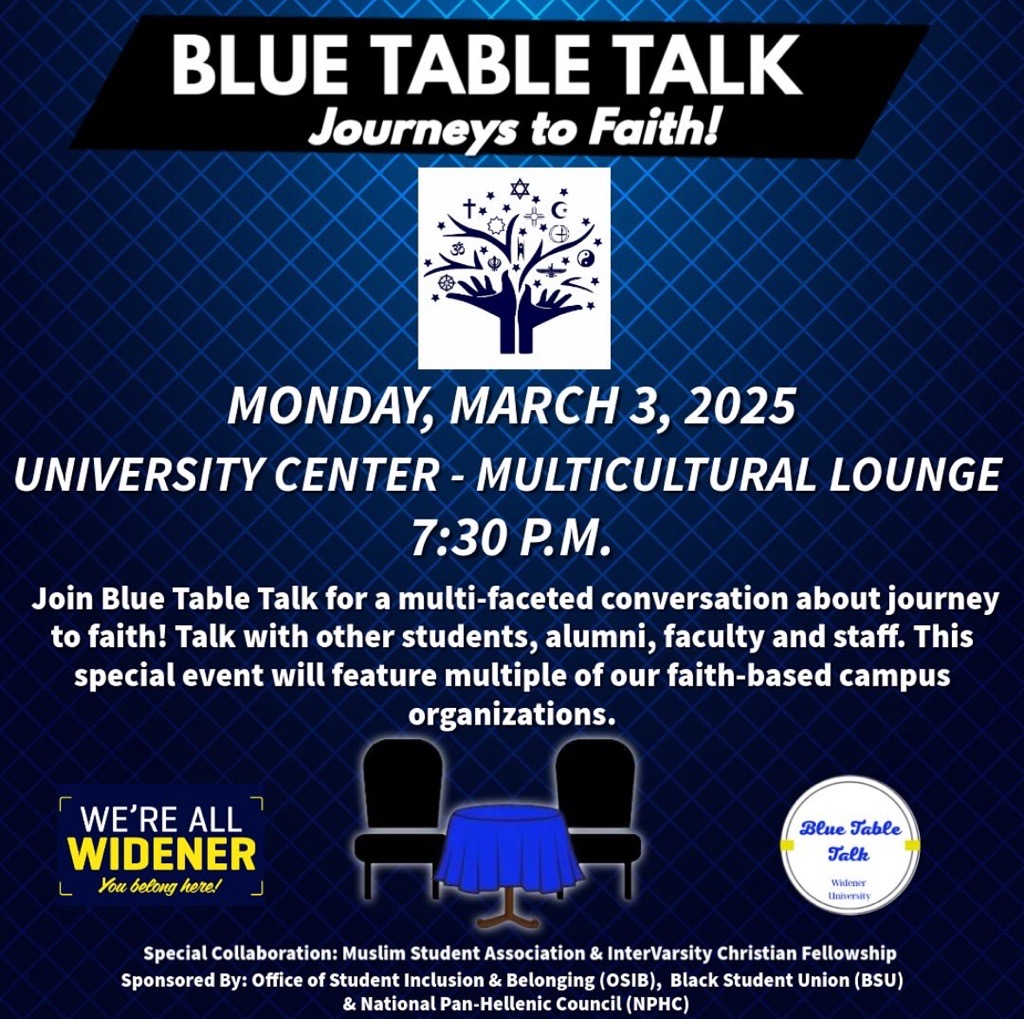 Join Blue Table Talk for a multi-faceted conversation about journey to faith! Talk with other students, alumni, faculty, and staff. This special event will feature multiple of our faith-based campus organizations.